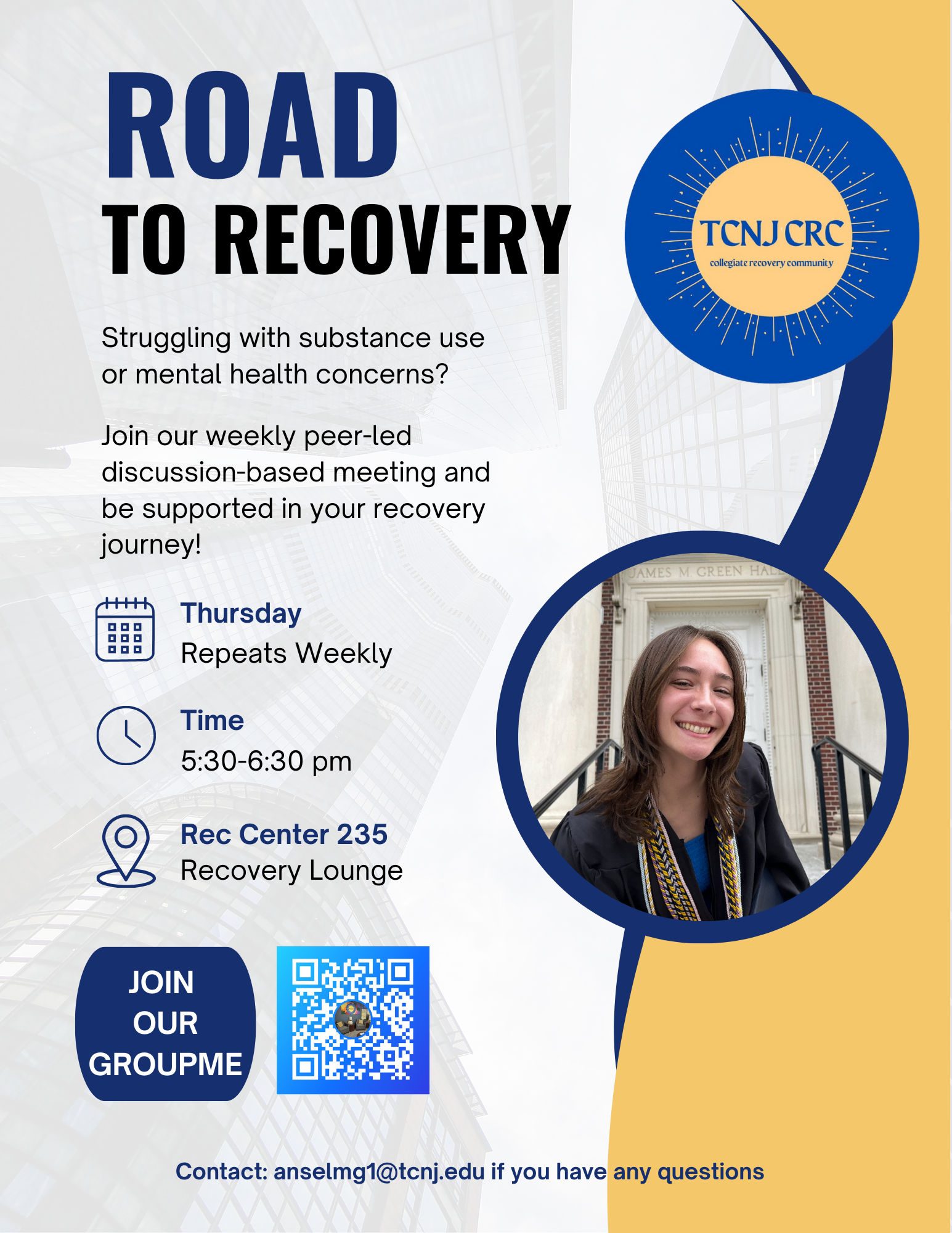 Schedule a session with a Certified Peer Recovery Specialist (CPRS), also known as a Recovery Coach! These trained students and staff members will “meet you where you are at” in your recovery journey and provide personal experience, feedback, and encouragement to help you make and meet self-directed goals. Please reach out to Eric Van Eck at vaneck3@tcnj.edu to learn more.